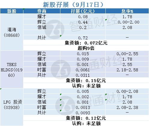 智通财经APP获悉,瀛海(08668)、TBKS HLDGS(01960)和LFG投资(03938)正在招股中。截至9月17日,辉立、耀才、时富、信诚分别为其借出近0.72亿、0.0311亿和0.0093港元,其中TBKS HLDGS和LFG投资孖展未足额,瀛海超购逾9倍。