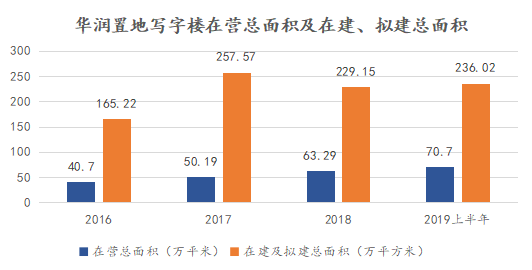 如若观察近年来华润置地在写字楼方面的发展,可以发现其战略发生了调整。2016-2018年,华润置地在建及拟建的写字楼总楼面面积分别为165.22万平方米、257.57万平方米、229.15万平方米,在营的写字楼总楼面面积分别为40.70万平方米、50.19万平方米,63.29万平方米。