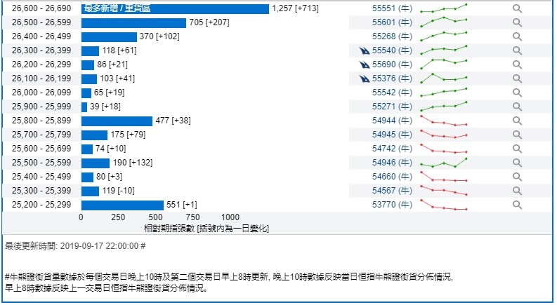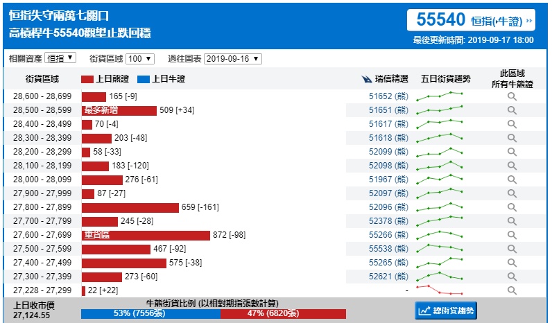 智通财经APP获悉,截至9月17日,恒指最新的牛熊街货比例53:47。瑞信恒指牛熊证街货分布图中的数据显示,熊证街货重货区在27600-27699区间,该区间最新熊证数量为872张,较上一交易日减少98张;最多新增在28500-28599区间,新增34张。牛证街货重货区在26600-26690区间,该区间最新牛证数量为1257张,比上一交易日增加713张;最多新增区间在同一区间。