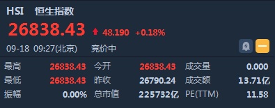 智通财经APP获悉,恒生指数开盘涨48.19点或0.18%,报26838.43点。国企指数涨0.17%,报10519.96点。红筹指数涨0.11%,报4294.62点。大市盘前成交13.71亿港元。隔夜美股小幅收涨,道指涨逾30点。