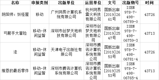 智通财经APP获悉,今天(9月18日),国家新闻出版广电总局官方显示,2019年9月份国产网络游戏版号名单更新,共63款游戏获批,审批时间为9月18日。其中腾讯(00700)的《洼》《维恩的最后零件》,网易(NTES.US)的《阴阳师:妖怪屋》、创梦天地(01119)的《弓箭手大冒险》等游戏获得版号。