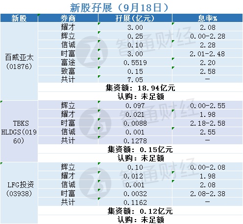智通财经APP获悉,百威亚太(01876)、TBKS HLDGS(01960)和LFG投资(03938)正在招股中。截至9月18日,辉立、耀才、时富、信诚、富途、致富分别为其借出近7.05亿、0.1278亿和0.1162亿港元,三者孖展均未足额。