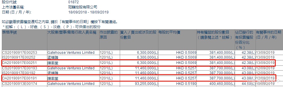 智通财经APP获悉,联交所最新资料显示,9月12日、13日,主席兼执董陈率堂两日分别减持冠轈控股(01872)1146万、630万股,每股作价分别为0.5257港元、0.5069港元,总金额约为912.80万港元,减持后最新持股数目约为3.81亿股,最新持股比例为42.38%。