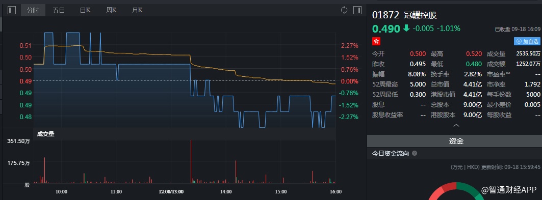 截至今日收盘,冠轈控股跌1.01%,报0.49港元。