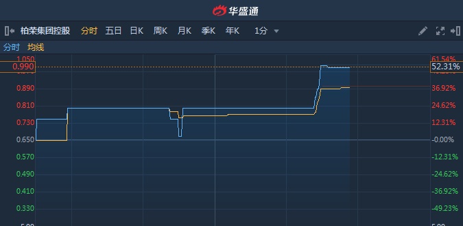 智通财经APP获悉,细价股柏荣集团控股(08316)午后无量拉涨超50%,高见1港元,创52周新高。截至14时45分,涨52.31%,报价0.99港元,成交额21.3万。值得注意的是,该股连续三日累计涨幅超300%。