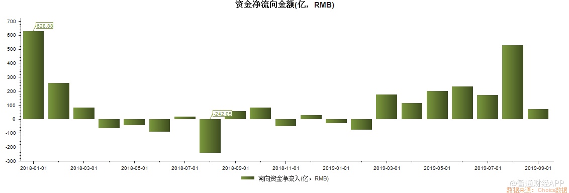 事实上,自2019年3月以来,南下资金已经持续6个月保持净流入,并在8月份净利润激增至528.85亿人民币,创下年内新高。年初至今,南下资金累计净流入1396.93亿元人民币,显著高于2018年全年净流入的671亿元人民币,增幅高达108.19%。