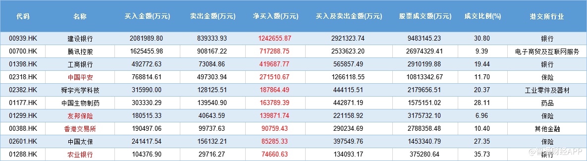 其中,建设银行获得获得南下资金净买入额最大,合计134.31亿元,其中沪港股通净买入124.27亿元,深港股通净买入10.04亿元。其次是腾讯控股,获得南下资金净买入合计88.62亿元,其中沪港股通净买入71.73亿元,深港股通净买入16.89亿元。工商银行排名第三,获得南下资金净买入合计47.47,其中沪港股通干净买入41.97亿元,深港股通净买入5.5亿元。
