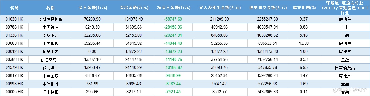 至于资金流出方面,沪港股通和深港股通的相似度则较低,但均流出新城发展控股(01030),合计净流出11.81亿元,其中沪港股通净流出5.31亿元,深港股通净流出5.87亿元。