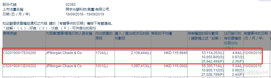 智通财经APP获悉,联交所最新资料显示,9月12日,小摩减持舜宇(02382)213.84万股,每股作价115.9845港元,总金额约为2.48亿港元,减持后最新持股数目约为5311.43万股,最新持股比例为4.84%。