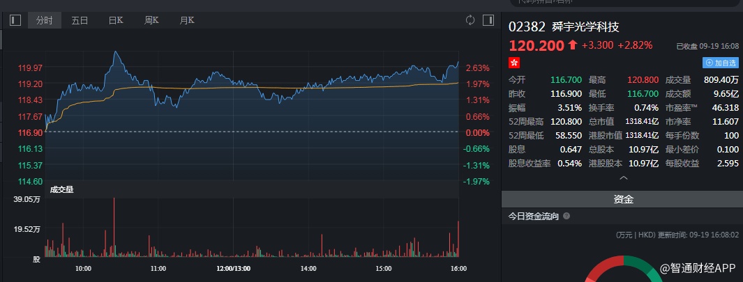 截至今日收盘,舜宇(02382)涨2.82%,报120.20港元。