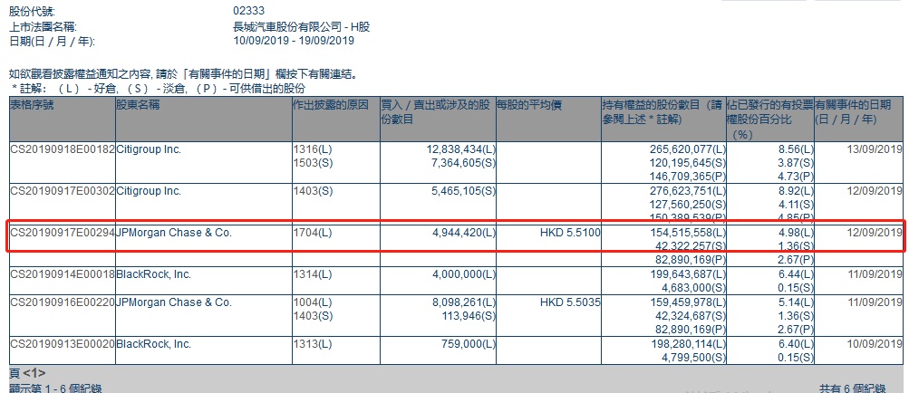 智通财经APP获悉,联交所最新资料显示,9月12日,长城汽车(02333)被摩根大通减持约494.44万股,每股平均价5.51港元,涉及总金额约为2724.4万港元。减持后摩根大通最新持股数目约为1.55亿股,最新持股比例为4.98%。