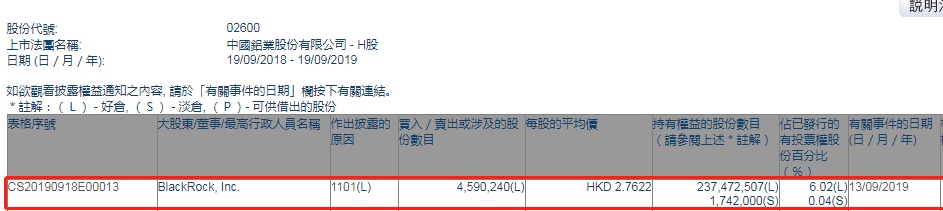 智通财经APP获悉,联交所最新资料显示,9月13日,贝莱德增持中国铝业(02600)459.024万股,每股作价2.7622港元,总金额约为1267.92万港元。增持后最新持股数目约为2.37亿股,最新持股比例为6.02%。