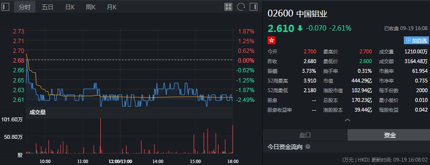截至今日收盘,中国铝业(02600)跌2.61%,报2.61港元。