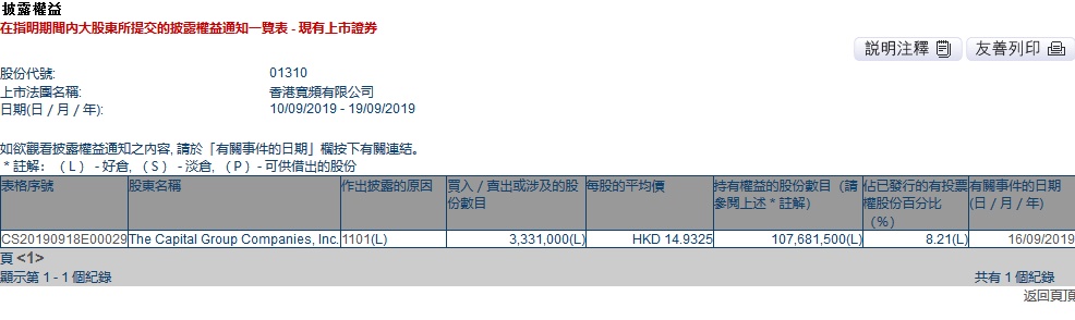 智通财经APP获悉,联交所最新资料显示,9月16日香港宽频(01310)获美国资本集团增持333.1万股,每股作价14.9325港元,总值约为4974万港元,最新持股数目约为1.08亿股,最新持股比例为8.21%。