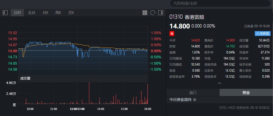 截止今日收盘,香港宽频无涨跌,报14.8港元。
