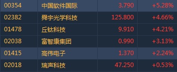 30系列智能手机,受消息刺激,相关个股集体上涨。截至9时50分,中国软件国际(00354)涨5.28%,舜宇光学(02382)涨4.66%,丘钛科技(01478)涨4.21%,高伟电子(01415)涨2.24%,瑞声科技(02018)涨0.53%。