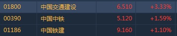 智通财经APP获悉,中共中央、国务院印发《交通强国建设纲要》,助力重型基建板块随A股走高。截至10时08分,中国交通建设(01800)涨3.33%,报价6.51港元,中国中铁(00390)涨1.59%,中国铁建(01186)涨1.1%。