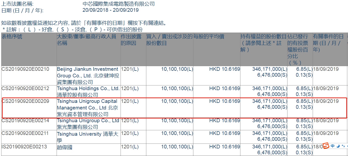 智通财经APP获悉,联交所最新资料显示,9月18日,北京紫光资本管理有限公司减持中芯国际(00981)1010万股,每股作价10.6169港元,总金额约为1.07亿港元,减持后最新持股数目约为3.46亿股,最新持股比例为6.85%。
