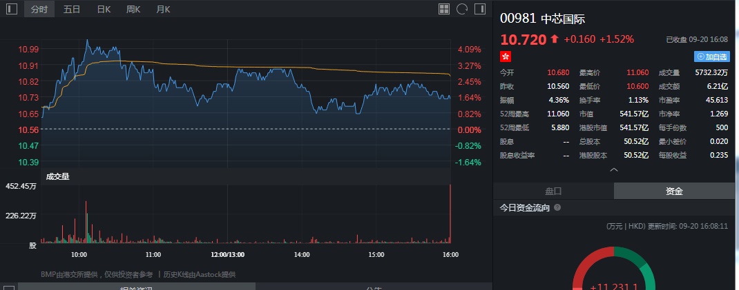 截至今日收盘,中芯国际(00981)涨1.51%,报10.72港元。