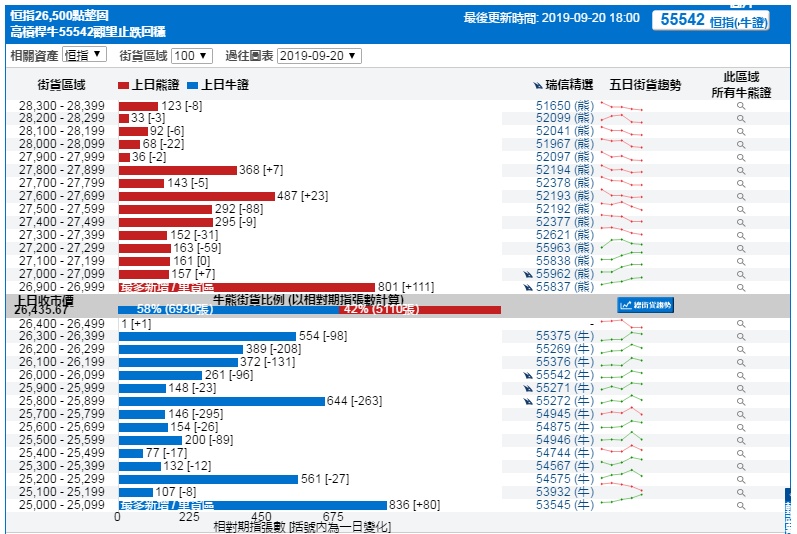 智通财经APP获悉,截至9月20日,恒指最新的牛熊街货比例58:42。瑞信恒指牛熊证街货分布图中的数据显示,熊证街货重货区在26900-26999区间,该区间最新熊证数量为801张,较上一交易日增加111张;最多新增在同一区间。牛证街货重货区在25000-25099区间,该区间最新牛证数量为836张,比上一交易日增加80张;最多新增也落在这一区间。