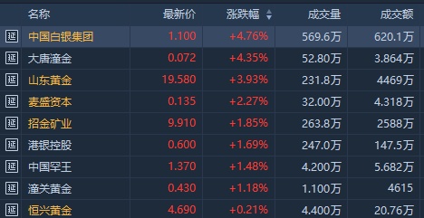 截至发稿,中国白银集团(00815)涨5.71%,报1.11港元;山东黄金(01787)涨3.5%,报19.5港元;招金矿业(01818)涨2.36%,报9.96港元;灵宝黄金(03330)涨2.22%,报1.38港元。