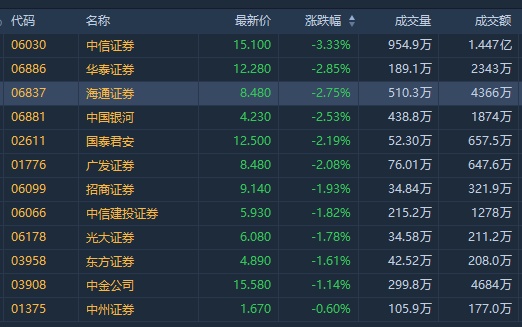截至发稿,中信证券(06030)跌3.46%,报15.08港元;华泰证券(06886)跌2.85%,报12.28港元;中国银河(06881)跌2.53%,报4.23港元;国泰君安(02611)跌2.35%,报12.48港元。