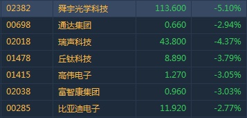 智通财经APP获悉,手机供应链全集体高位回吐,舜宇光学(02382)挫逾5%,暂领跌蓝筹。截至11时05分,舜宇光学跌5.1%,报价113.6港元,通达集团(00698)跌2.94%,高伟电子(01415)跌3.05%,比亚迪电子(00285)跌2.77%。