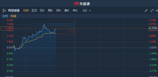 智通财经APP获悉,阿里巴巴2019年投资者大会开幕,阿里概念股全线上涨,阿里健康(00241)一度升逾5%,截至11时13分,涨4.76%,报价7.26港元,成交额6076万。
