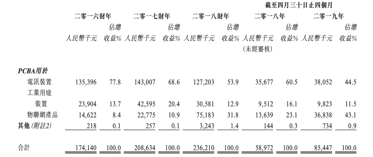 公司的产品为通常用于嵌入客户或客户的最终客户之品牌下的电讯装置、 工业用途装置、物联网产品及其他装置等下游电子产品的PCBA。下表载列于往绩记录期间按与公司PCBA组装的电子产品种类划分的收益明细。