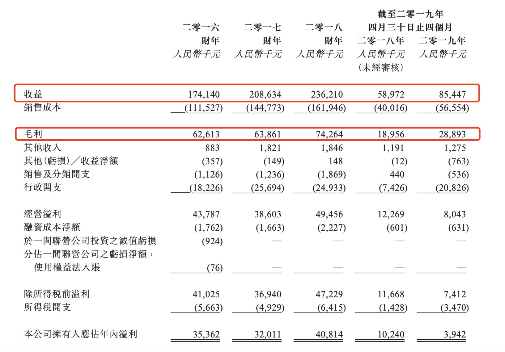 截至2018年止三个年度以及截至2018年及2019年4月30日止四个月,公司的收入分别约为人民币1.74亿元、2.09亿元、2.36亿元、5897万元以及8545万元;毛利润分别为人民币6261万、6386万、7426万及2889万,分别相当于毛利率约36.0%、30.6%、31.4%及33.8%。截至2019年4月30日止4个月毛利率增加主要由于公司使用自身的生产设施生产出更多产品,进而减少第三方分包商的分包生产,分包费用减少约人民币130万元。