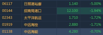 智通财经APP获悉,波罗的海干散货指数连续下探,港股港口船运股集体走弱,截至14时41分,日照港裕廊(06117)跌5%,报价1.14港元,招商局港口(00144)跌1.94%,太平洋船运(02343)跌1.72%,中远海能(01138)跌0.7%。