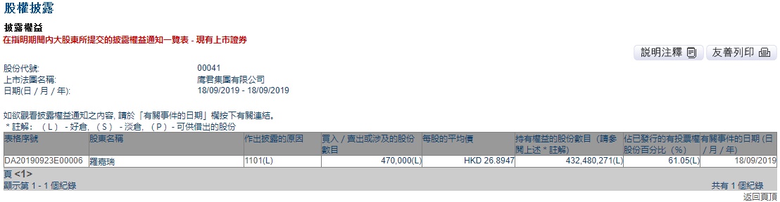 智通财经APP获悉,联交所最新资料显示,9月18日,主席罗嘉瑞增持鹰君(00041)47万股,每股作价26.8947港元,总金额约为1264.05万港元。增持后最新持股数目约为4.32亿股,最新持股比例为61.05%。