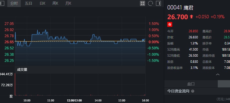 截至今日收盘,鹰君涨0.19%,报26.7港元。