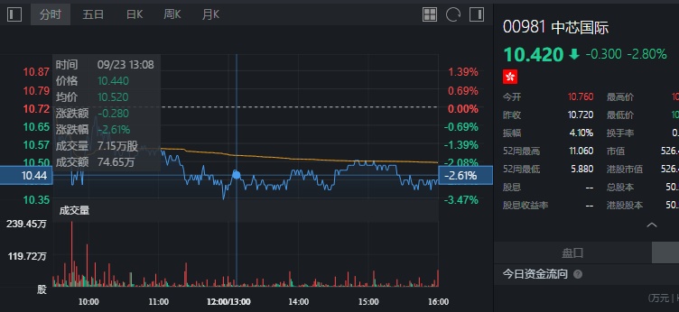 截至今日收盘,中芯国际跌2.8%,报10.42港元。