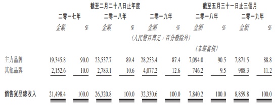 截至最后实际可行日期,公司的品牌组合主要包括耐克、阿迪达斯、彪马、匡威、威富集团的品牌(即范斯、TheNorthFace及添柏岚)、锐步、亚瑟士、鬼冢虎及斯凯奇。在该等品牌中,主力品牌耐克及阿迪达斯是对公司销售收入贡献最大和合作纵深最深的前两大品牌。截至2017年、2018年及2019年2月28日止年度及截至2019年5月31日止三个月,公司的主力品牌货品销售分别佔公司销售货品总收入的90.0%、89.4%、87.4%及88.8%。
