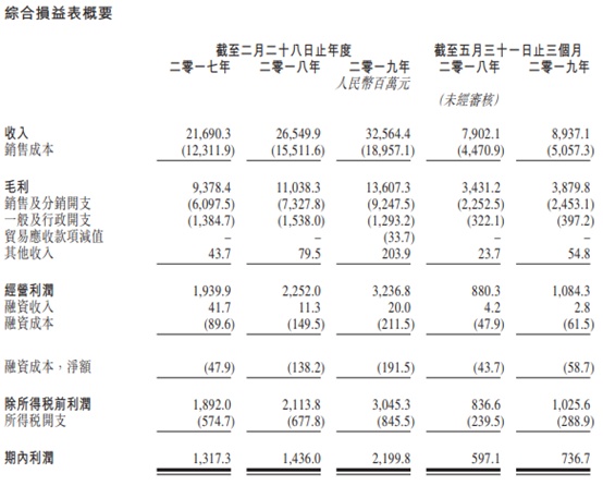 财务表现来看,截至2017年、2018年和2019年2月28日止年度及截至2019年5月31日止三个月,滔搏运动的总收入分别为216.9亿、265.5亿、325.6亿,89.4亿元人民币;毛利分别为93.8亿、110.4亿、136.1亿,38.8亿元人民币。