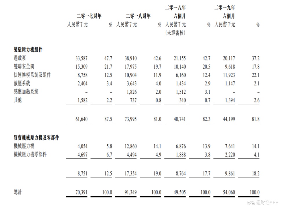 自销售快速换模系统及组件的收益位列第三,于2017财年及2018财年分别约为人民币880万元及人民币1090万元,分别占总收益约12.5%及11.9%。值得注意的是,于2019年6个月,销售快速换模系统及组件收益位为第二,第三位为来自销售双联安全阀的收益。该两项收益分别约为人民币1190万元及人民币960万元,分别占总收益的约22.1%及17.8%。