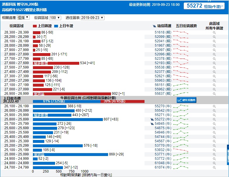 智通财经APP获悉,截至9月24日,恒指最新的牛熊街货比例61:39。瑞信恒指牛熊证街货分布图中的数据显示,熊证街货重货区在26900-26999区间,该区间最新熊证数量为902张,较上一交易日增加1张;最多新增在27600-27699,较上一交易日增加41张。牛证街货重货区在25000-25099区间,该区间最新牛证数量为869张,比上一交易日增加29张;最多新增落在25900-25999,较上一交易日增加287张。