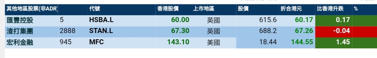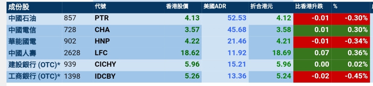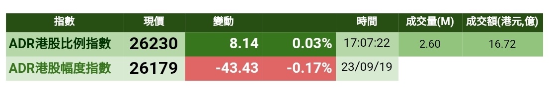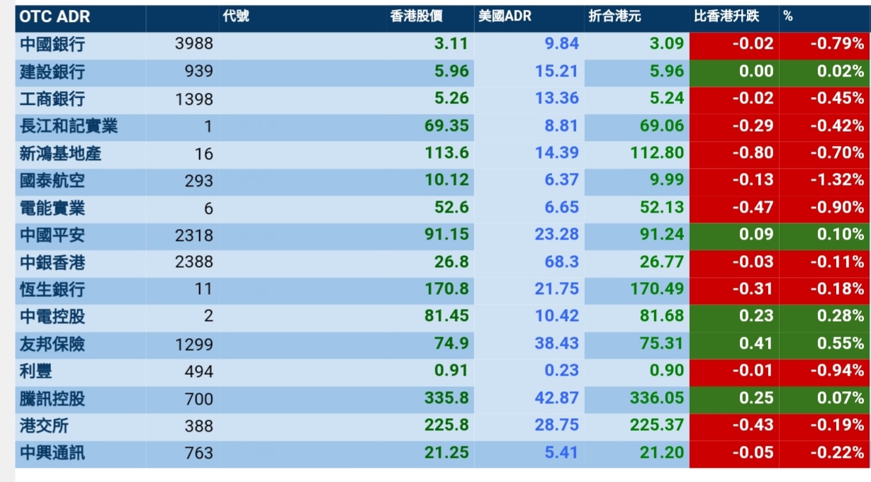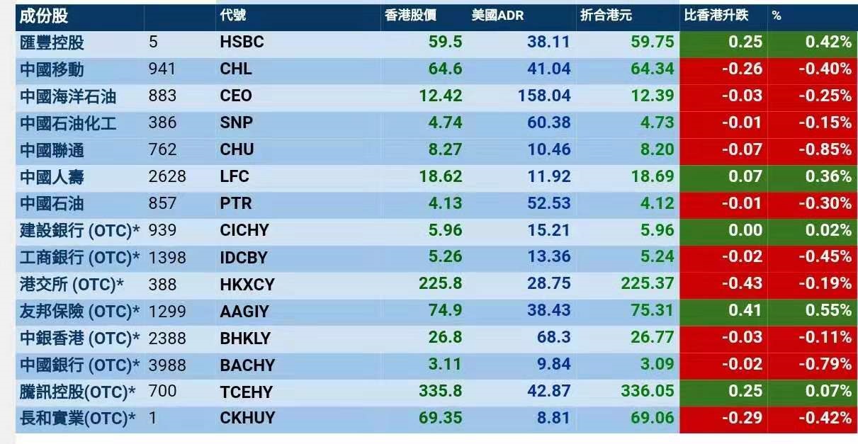 智通财经APP获悉,美股周一低开回升,三大股指大致收平,港股ADR指数轻微上涨。按比例计算,收报26320点,涨8.14点或0.03%。大型蓝筹股方面,汇丰控股(00005)收报59.75元,较港收市涨0.25元;腾讯控股(00700)收报336.05元,较港收市涨0.25元。