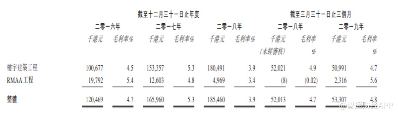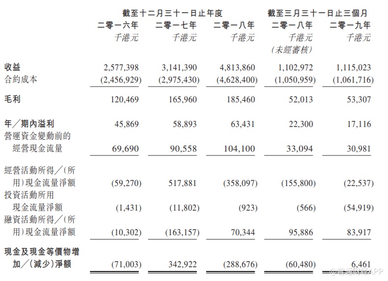 招股书显示,截止2016至2018年度及2019年3月31日,公司实现营收分别为25.77亿港元、31.41亿港元、48.14亿港元及11.15亿港元,2016年至2018年期间复合增长率为36.68%;毛利分别为1.20亿港元、1.66亿港元、1.85亿港元及5330.7万港元;年/期内溢利分别为4586.9万港元、5889.3万港元、6343.1万港元及1711.6万港元。