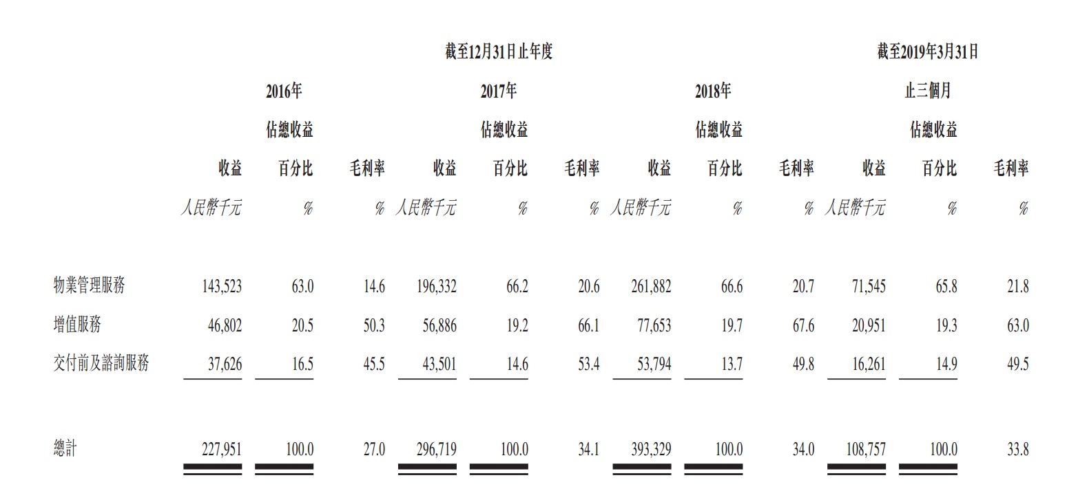 截至2016年、2017年及2018年及截至2019年3月31日止三个月,其物业管理业务的毛利率分别为14.6%、20.6%、20.7%、21.8%;增值业务毛利率分别为50.3%、66.1%、67.6%、63%;咨询服务毛利率分别为45.5%、53.4%、49.8%、49.5%。