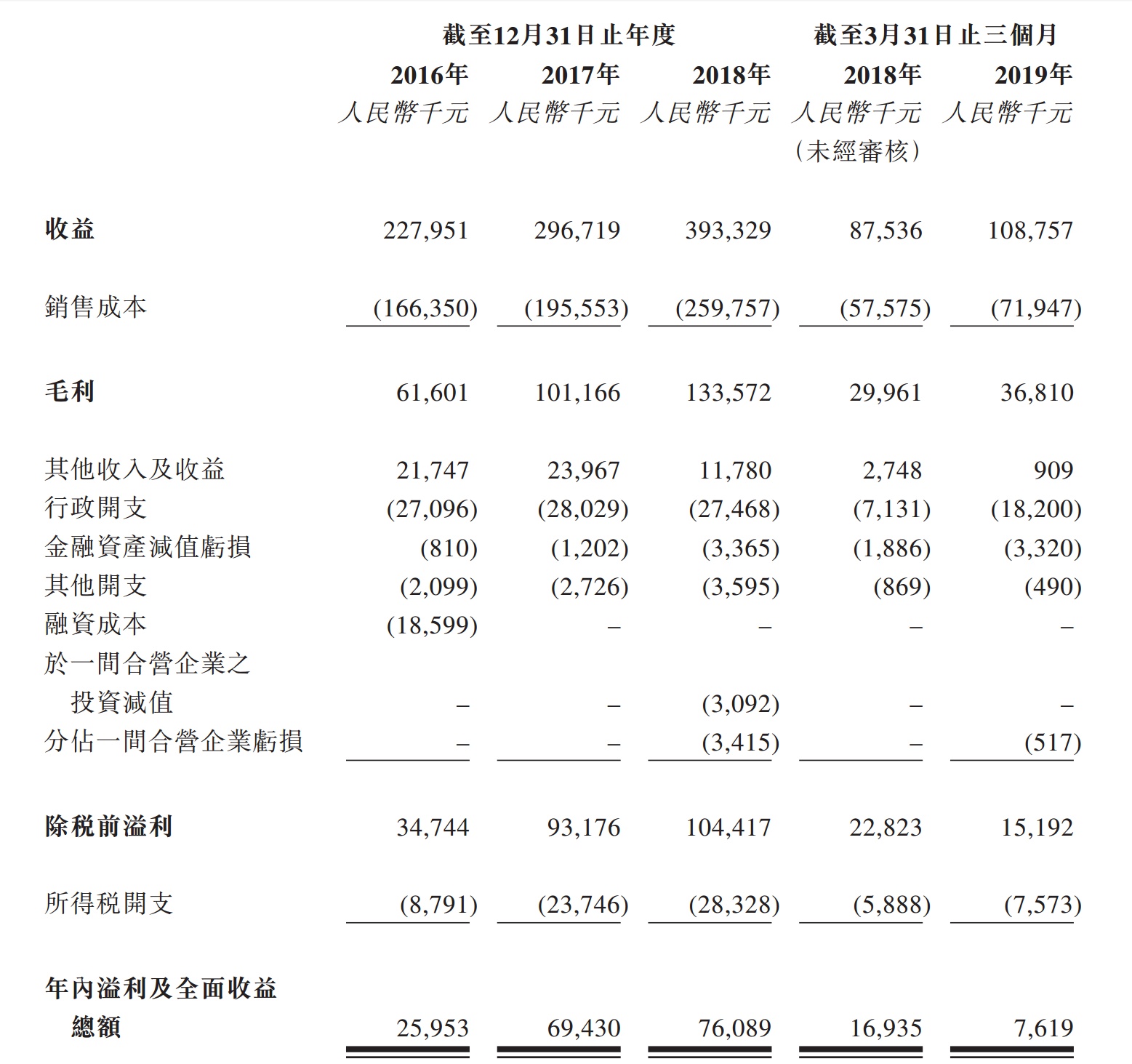 财务数据方面,截至2016年、2017年及 2018年12月31日止年度各年及截至2019年3月31日止三个月,我们的总收益分别约为2.28亿、2.97亿、3.93亿元,2016年至2018年的复合年增长率约为31.3%。期内实现纯利约2600万、6940万、7610万、762万元,2016年至2018年的复合年增长率约为71.1%。