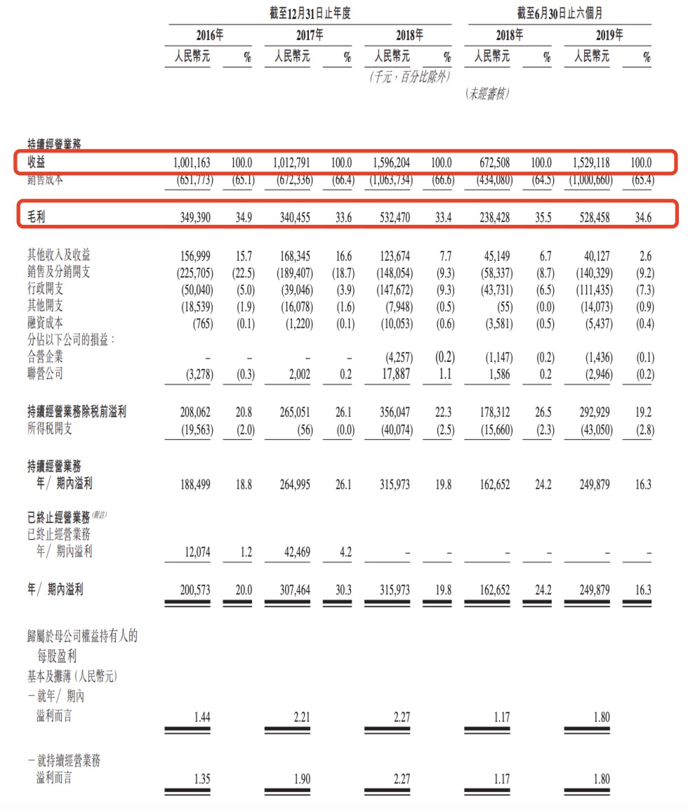 截至2016年、2017年及2018年12月31日止年度以及截至2018年及2019年6月30日 止六个月,公司来自持续经营业务的收益分别为人民币10.012亿元、人民币10.128亿 元、人民币15.962亿元、人民币6.725亿元及人民币15.291亿元。毛利分别为3.49亿元、3.4亿元、5.32亿元、2.38亿元和5.28亿元。