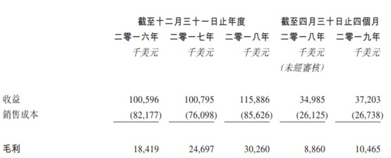 据招股书显示,截至2018年12月31日前3个年度,及截至2018年和2019年前四个月。集团收益分别为1.005亿,1.007,1.158亿,3498万和3720万美元。