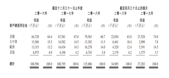 值得注意的是,该集团对大客户和北美市场的依赖性较大,截至二零一八年十二月三十一日止前三个年度各年及截至二零一九年四月三十日止四个月,自五大客户所得收益分别占总收益约57.5%、59.0%、66.1%及68.6%,以及来自最大客户所得收益分别占集团总收益约20.3%、28.0%、33.5%及27.3%。