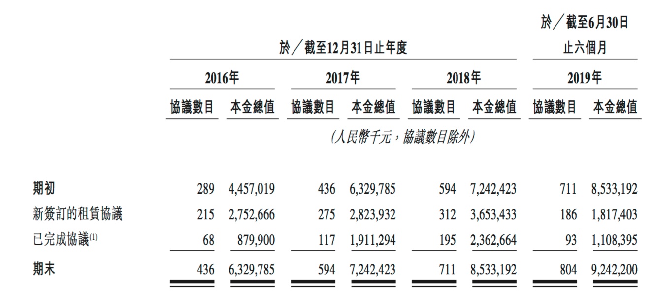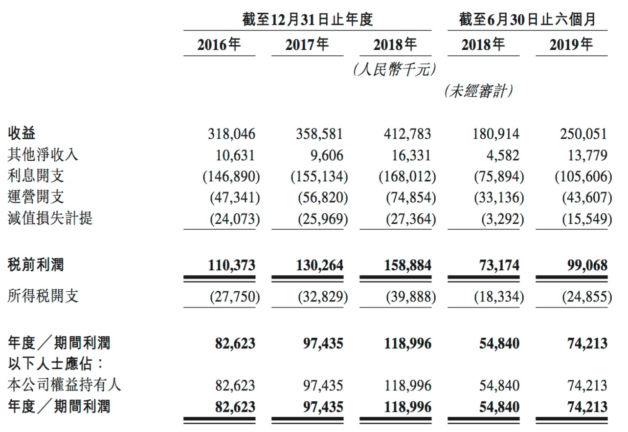 于往绩记录期间,中关村科技租赁的总收益由2016年的约318.0百万元增加至于2018年的412.8百万元,复合年增长率为13.9%;并由2018年6月30日前六个月的约180.9百万元增加至2019年6月30日前六个月的250.1百万元,增长率为38.2%。