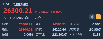 智通财经APP获悉,恒生指数开盘涨77.81点或0.3%,报26300.21点。国企指数涨0.32%,报10320.77点。红筹指数涨0.6%,报4237.59点。大市盘前成交20.3亿港元。
