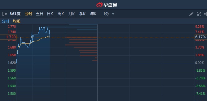 智通财经APP获悉,361度(01361)早盘急升逾8%,高见1.76港元,创近五个月新高。截至10时31分,涨6.17%,报价1.72港元,成交额730.8万。