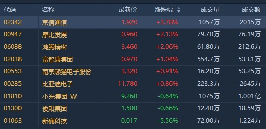 截至发稿,京信通信涨3.24%,报1.91港元;中国通信服务(00552)涨2.03%,报4.52港元;中国移动(00941)涨1.78%,报65.75港元;俊知集团(01300)微跌0.66%,报1.5港元。