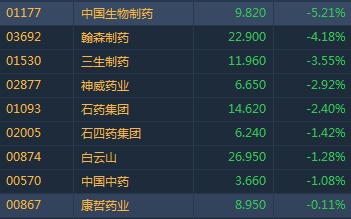 截至11时05分,中生制药跌5.21%,报价9.82港元,三生制药(01530)跌3.55%,神威药业(02877)跌2.92%,白云山(00874)跌1.28%。